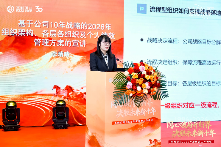 2026 年 1 月 24 日,圣和藥業(yè) 2026 年度經(jīng)營(yíng)工作會(huì)議在南京圣和府邸豪華精選酒店隆重召開(kāi)。作為企業(yè)深耕醫(yī)藥行業(yè)三十載、邁向新十年征程的關(guān)鍵節(jié)點(diǎn),本次會(huì)議以 “同心破局開(kāi)新界,決勝未來(lái)新十年” 為核心主題,匯聚 2025 年度部分受表彰人員、各級(jí)管理人員及研發(fā)高級(jí)研究員現(xiàn)場(chǎng)參會(huì),其余員工通過(guò) “圣和藥業(yè)”視頻號(hào)線上同步參與。會(huì)議主要由產(chǎn)品與創(chuàng)新體系負(fù)責(zé)人張小猛與人力資源總監(jiān)李晴晴主持,聚焦戰(zhàn)略落地與責(zé)任傳遞,全程緊湊務(wù)實(shí)、凝心聚力。